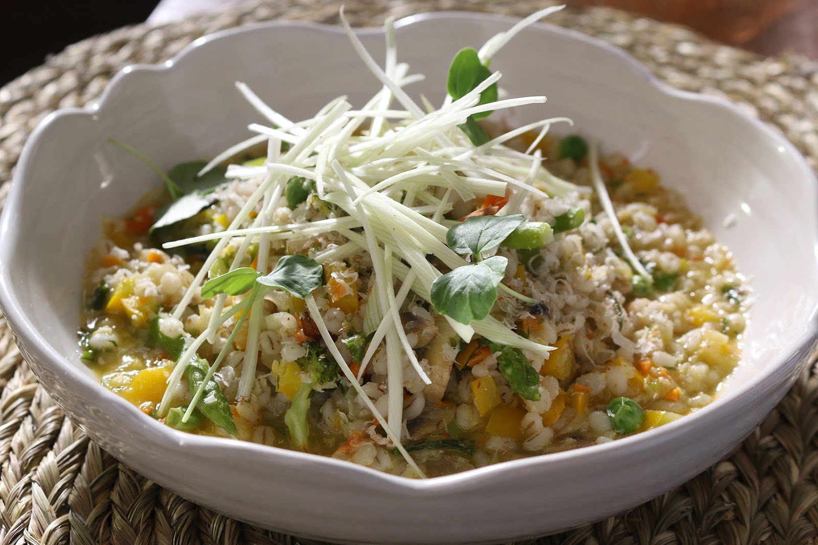 2 cups barley, cooked, 1 small onion, 5-6 button mushrooms, 4-5 cauliflower florets, 6-8 green peas, 4-5 broccoli florets, 1 small carrot, 2 inch piece ginger, 2 garlic cloves, 1 green chilli, 6-8 asparagus stalks, 1 tsp olive oil, ¼ cup chopped yellow bell peppers, Crushed black peppercorns to taste, Salt to taste, 2-3 fresh parsley sprigs, 2-3 fresh rosemary sprigs,