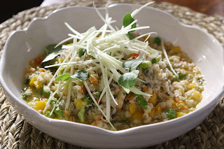 - Slice leek finely. Transfer the risotto into a serving plate.