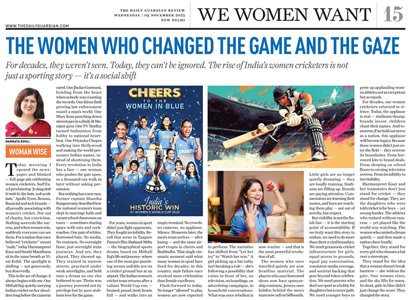 Today morning I opened the newspaper and blinked — full-page ads celebrating women cricketers. Surf Excel proclaiming “jo daag desh ki mitti ke liye hain, woh acche hain,” Apollo Tyres, Rexona, financial and tech brands — all proudly associating with women’s cricket. Not out of charity, but conviction. Nothing succeeds like success, and when women win, suddenly everyone can see them. For a nation that once believed “cricketer” meant “male,” today Harmanpreet Kaur and Smriti Mandhana sit in the same breath as Virat Kohli. The spotlight is shifting — not generously, but deservedly.